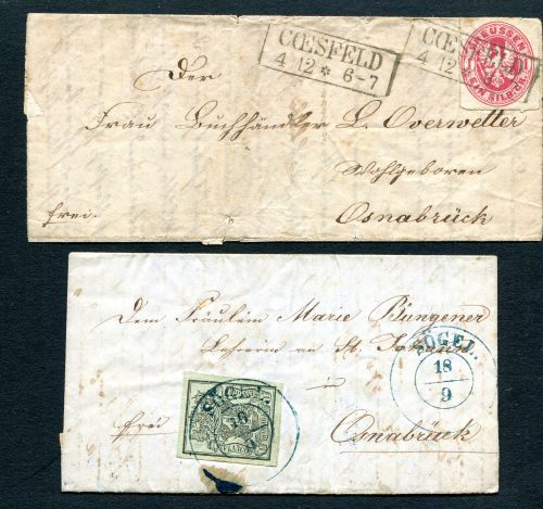 2 Kleinbriefe Preußen Stempel Coesfeld und Hannover Mi.Nr. 2 Stempel Sögel in blau, in gebrauchter Erhaltung.