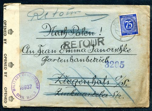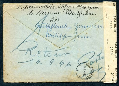 1946 Mi.Nr. 935 , EF auf Zensurbrief, ab Schloss Hessen bei Hamm in Westfalen, befördert nach Polen. (Ziegenhals in Ober-Schlesien, damals "GLUCHOLAZY" dort mit Ankunftstempel 14.9.46 sowie Stempel RETOUR und 2 mal handschriftlich Retour, zurück nach Deutschland.