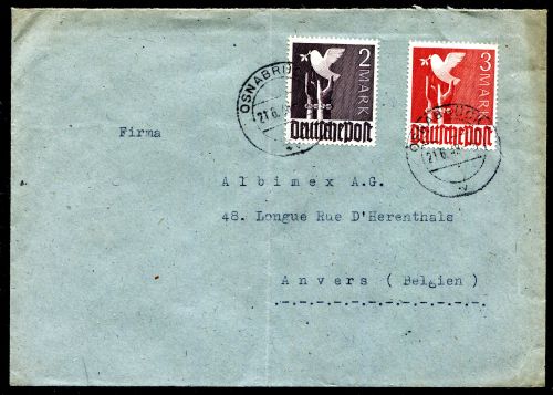 1948 Alliierte Besetzung Mi.Nr. 960 und 961 MiF Beleg mit 2 Mark und 3 Mark Freimarken Kontrollratsausgabe II, auf Auslandsbrief ab Osnabrück 21.6.1948 nach Anvers in Belgien.
