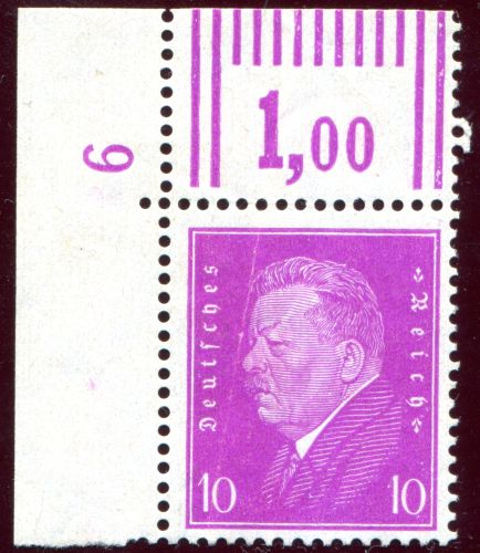 1930 Mi.Nr. 355 , Walze 10 Pfennig Ebert. mit Oberrand aus der Bogenecke oben links mit Seitenrand - Nr. 9