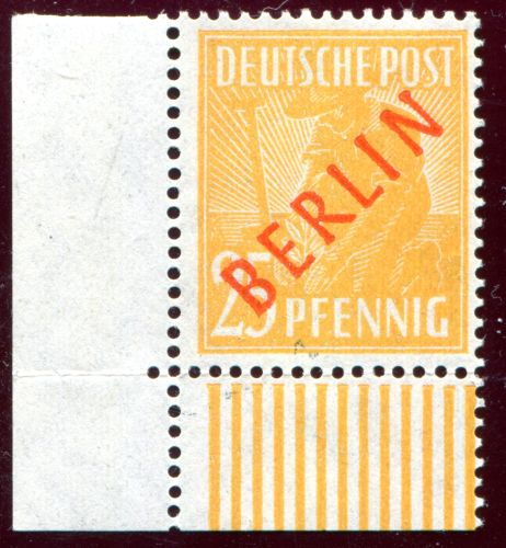 1949 Mi.Nr. 27 , 25 Pfennig Rotaufdruck, aus der Bogenecke unten links, gefaltet, geprüft "Schlegel BPP" Mi.(100,--)Euro.