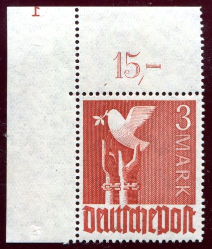 1947 Mi.Nr. 961 , Platte, OR dgz. 3 Mark Bogenecke oben links mit Plattennummer 1 "Auf der Rückseite auch Plattennummer 3 zu lesen. Kontrollratsausgabe II.