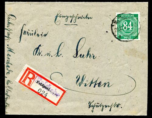 1946 Mi.Nr. 936 , , EF, R-Brief mit R Aufkleber "Feldpost Meschede" befördert nach Witten.