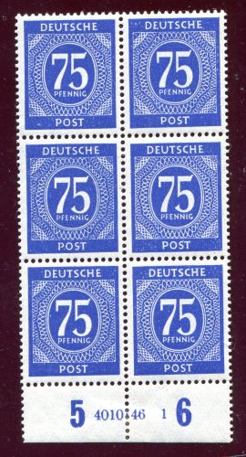 1946 Mi.Nr. 934 , 75 Pfennig, mit HAN Nr. "4010.46. 1". Alliiert Besetzung Kontrollratsausgabe I. Im 6er Block,