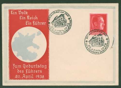 Ein Volk Ein Reich Ein Führer. Zum Geburtstag des Führers 20. April 1938 mit Sonderstempel "BRAUNAU AM INN", ungebraucht, in guter Erhaltung.