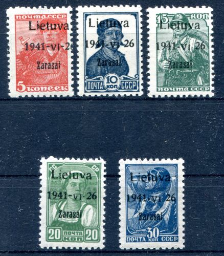 1941 Mi.Nr. 1/5 , Freimarken der Sowjetunion mit waagerechtem Aufdruck in Schwarz "Lietuva - 1941 VI - 26 Zarasai".