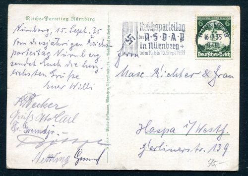 1935 Reichsparteitag Nürnberg vom 10.-16. September 1935 echt befördert nach Haspa/Westf, üblich erhalten.