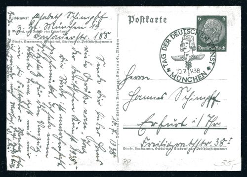 1938 Tag der Deutschen Kunst, mit passenden Sonderstempel vom 10.7.1938 München, echt befördert nach Erfurt.