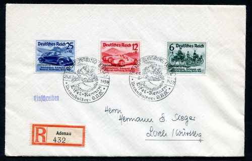 1939 Mi.Nr. 395/97 , , Nürnburgring - Rennen mit Aufdruck, kompletter Satz auf R-Brief, ab Adenau nach E. Sieger Lorch.