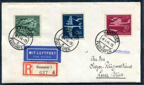 1944 Mi.Nr. 866/68 , , Luftpostdienst, kompletter Satz auf R-Brief, ab Hannover - Flughafen 8.4.44 mit Luftpost befördert nach E. Sieger Lorch.