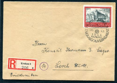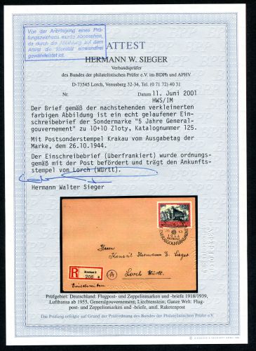 Generalgouvernement 1944 Mi.Nr. 125 , , EF, Sondermarke 5 Jahre Generalgouvernement, auf R-Brief ab KRAKAU mit Ersttags - Sonderstempel 26.10.44 befördert nach E. Sieger Lorch. Mit FOTOATTEST. Mi.(350.--)Euro.