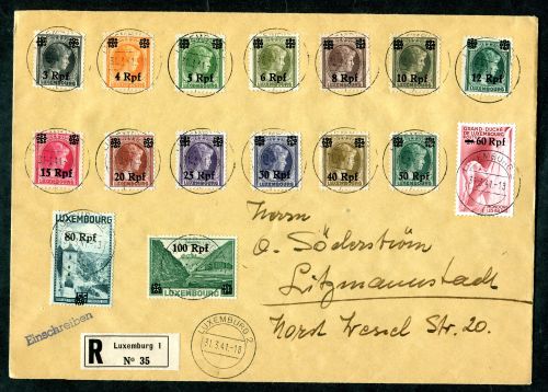 Luxemburg Besetzung 1940 Mi.Nr. 17/32 Satzbrief per Einschreiben ab Luxemburg 31.3.1941 nach Litzmannstadt mit Ankunftstempel 05.4.41 Mi. über (120.--)Euro.