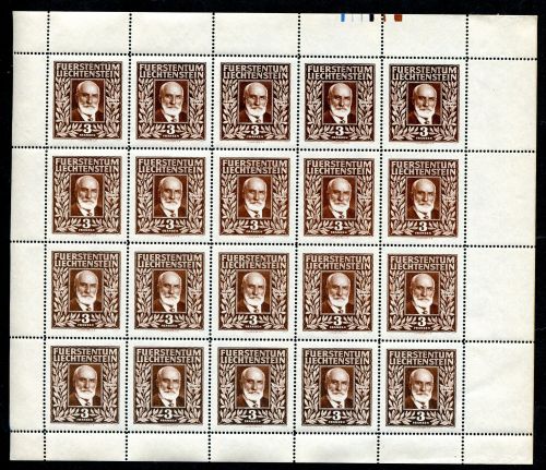 1940 Liechtenstein Mi.Nr. 191 , Höchstwert 3 Fr. zum 100. Geburtstag von Fürst Johann II., kompletter Bogen mit 20 Marken.