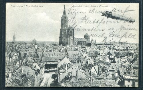 Postkarte Zeppelin. Zeppelin über Strassburg, befördert ab Strassburg nach Krefeld 11.8.1908