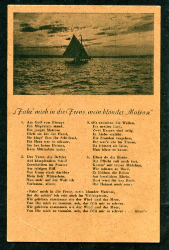 LIEDERKARTE. Fahr' mich in die Ferne, mein blonder Matrose, ungebraucht.
