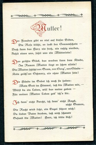 LIEDERKARTE. Mutter! Der Freuden gibt es viel auf dieser Erden, ungebraucht.