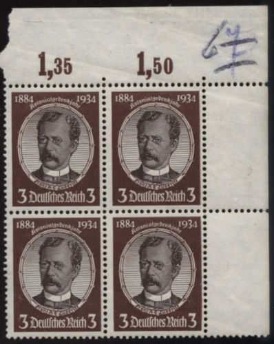 1934 Mi.Nr. 540 , aus der rechten oberen Bogenecke. Kolonialforscher Franz A. E. Lüderitz. Leichter durchgehender Bug. Mi.(128.--)Euro.