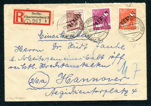 1948 Mi.Nr. 8II, 12, 14, , , MiF, Schwarzaufdruck, R- Brief ab Berlin Charlottenburg 2, vom 17.12.48 nach Hamburg. 8 Pfennig mit Plattenfehler, geprüft "SCHLEGEL BPP".