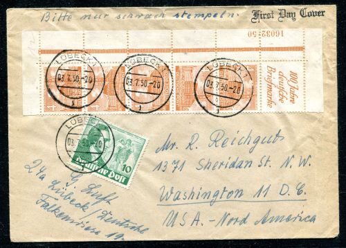 1949 Mi.Nr. 43 , , MeF, 4 Pfennig Berliner Bauten, mit HAN-Nr. 16032.50 aus Markenheftchenbogen, als senkrechter Fünferstreifen mit Aufdruck im Oberrand "100 Jahre deutsche Briefmarke", Auslandsbrief ab LÜBECK 1 am 03.7.50 nach WASHINGTON USA mit Zusatzfrankatur 10 Pfennig Goethe Mi.Nr. 61. Die HAN-Nr. 16032.50 ist im Michel Katalog bei der 4 Pfennig Marke Nr. 43 nicht aufgeführt.