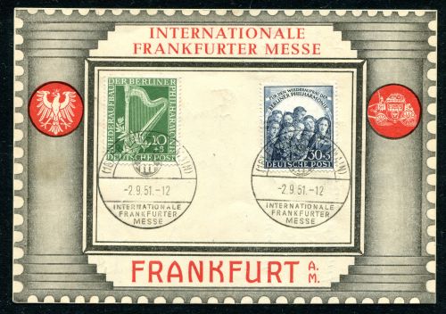 1950 Mi.Nr. 72 und 73 , Berliner Philharmonie, Satz auf Sonderpostkarte Frankfurter Messe mit 2 sauber abgeschlagene Messe - Sonderstempel vom 2.9.51. Karte echt befördert nach Passau.