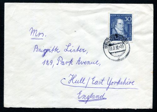 1951 Mi.Nr. 146 , , EF, 30 Pfennig Wohlfahrt. Höchstwert Johann Heinrich Pestalozzi, Auslandsbrief ab 20.3.52 Helmstedt nach Hull/East Yorkshire (England) Mi. 250.--)Euro.