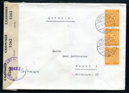 1946 Mi.Nr. 927 , , MeF, 25 Pfennig Ziffern Kontrollratsausgabe I, im 3er Streifen senkrecht, auf Auslandsbrief mit Zensur ab Köln 12.9.46 nach Basel Schweiz.