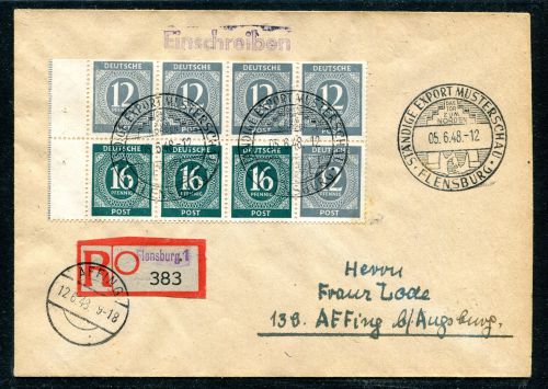 1946 Mi.Nr. H-Blatt 123 , , Ziffern Kontrollratsausgabe I, auf R-Brief ab Flensburg 05.6.48 nach Affing b/Ausburg. Mi. 350.-- Euro.