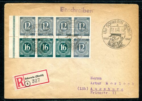 1946 Mi.Nr. H-Blatt 123 , , Ziffern Kontrollratsausgabe I, auf R-Brief ab Schwerin 27.3.48 nach Ausburg. Mi. 350.-- Euro.