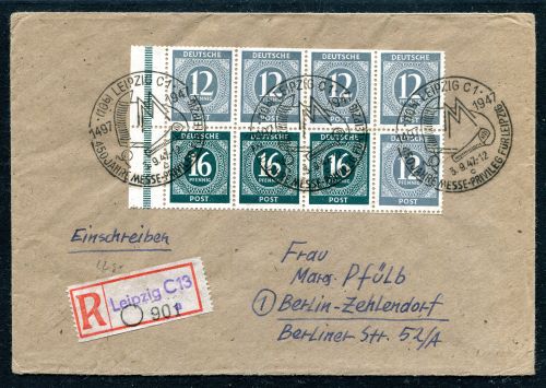1946 Mi.Nr. H-Blatt 123 , , Ziffern Kontrollratsausgabe I, auf R-Brief ab Leipzig 3.9.47 nach Berlin - Zehlendorf. Mi. 350.-- Euro.