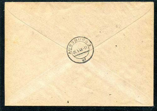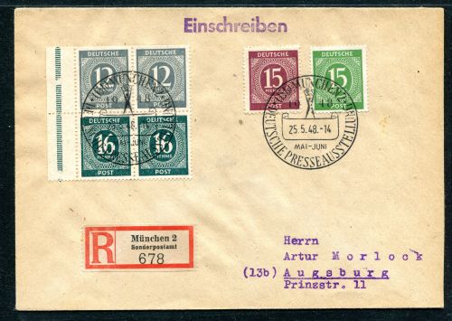 1946 Mi.Nr. S 294 , , Ziffern Kontrollratsausgabe I, Mi.Nr. 920 und 923 als , 12 und 16 Pfennig, sowie 921 und 922, auf R-Brief ab München 2 25.5.48 nach Augsburg.