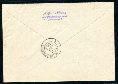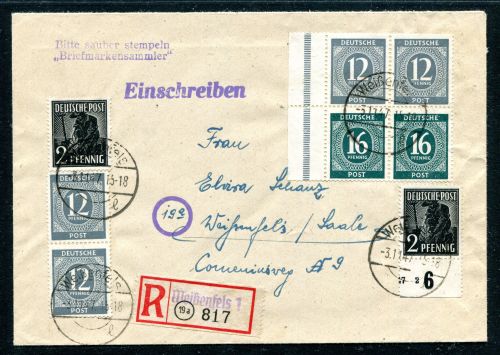 1946 Mi.Nr. S 294 , , Ziffern Kontrollratsausgabe I, Mi.Nr. 920 und 923 als , 12 und 16 Pfennig, sowie 2 Marken 920 senkrechtes Pärchen und 2 Marken 943 2 Pfennig, auf R-Brief ab Weißenfels 1, vom 3.11.47 Ortsbrief.