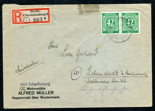 1946 Mi.Nr. 930 , , , MeF, 2 Marken als Pärchen 42 Pfennig Kontrollratsausgabe I, auf R- Brief ab Berlin- Charlottenburg 9 am 27.7.46 nach Lebenstedt bei Braunschweig. Rückseite Ankunftstempel.