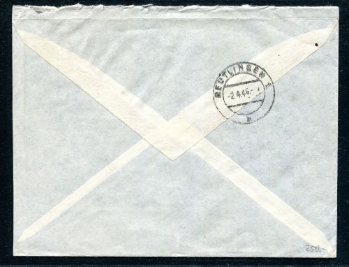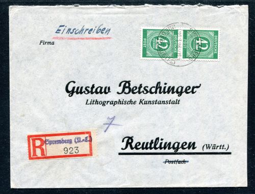 1946 Mi.Nr. 930 , , MeF, als senkrechtes Pärchen, 2 Marken 42 Pfennig Kontrollratsausgabe I, auf R-Brief ab Spremberg 22.3.46 nach Reutlingen. Rückseite Ankunftstempel.