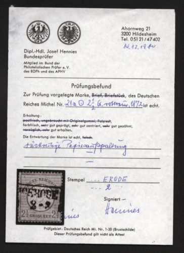 LIQUIDATIONSPOSTEN. 1872 Mi.Nr. 21a , 2 1/2 Groschen mit Befund (Hennis) rs. Papieraufspaltung, mit Stempel "...ERODE / ...2...". Mi.(85.--)Euro.