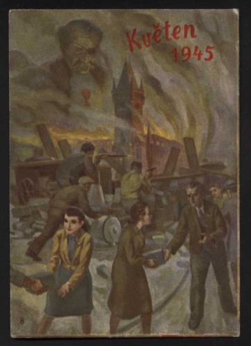 1945 tschechische Propagandakarte, Farbkarte ungebraucht, zeigend "KVETEN 1945" Männer und Frauen bei Aufräumarbeiten, werden in dieser guten Erhaltung selten angeboten.
