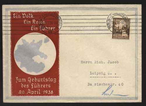 1938 Sonder Briefumschlag mit Farbeindruck Weltkugel und Inschrift "Ein Volk Ein Reich Ein Führer Zum Geburtstag des Führers 20. April 1938", mit Mi.Nr. 665 und Maschinenstempel Berlin Charlottenburg 10.7.38 befördert nach Leipzig.