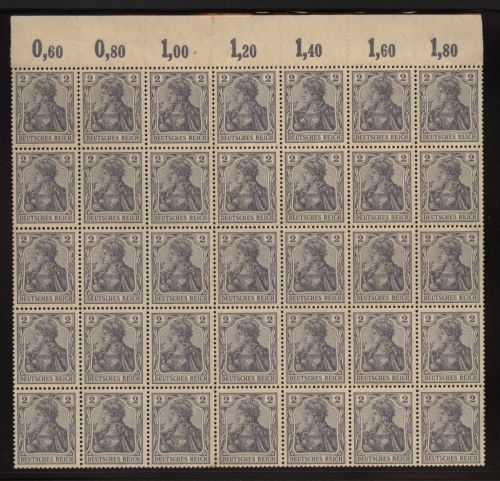 LIQUIDATIONSPOSTEN. 1905 bis 1913 Mi.Nr. 83I , 2 Pfennig Germania, 70 Marken im Bogenteil mit 7 Marken vom Oberrand. Mi.(420.--)Euro.