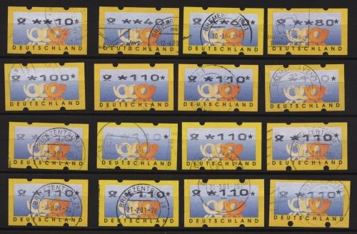 Automatenmarken , mit 2 Posthörner im unterem Bereich, sowie Posthornzeichen vor der Wertangabe, teils als Abarten.