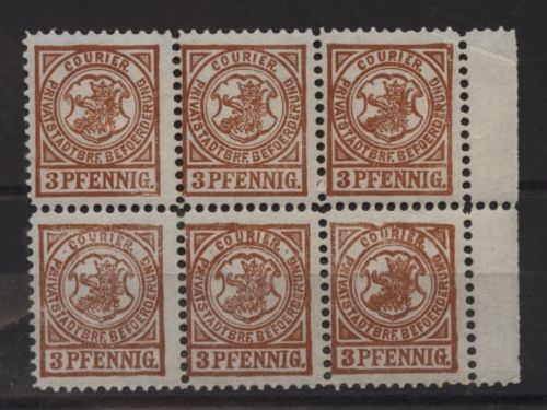 Courier Privatstadtbrief. Beförderung 3 Pfennig im 6er Block, leichte Farbspuren Gummiseite.