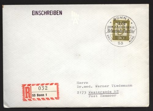 1961 Mi.Nr. 360y , , EF, 90 Pfennig als R-Brief, mit Ersttagssonderstempel "BONN 1 - 3.8.64" nach Westersode. SELTEN!