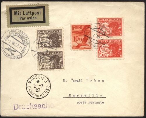 1927 Mi.Nr. 468 senkrechtes Pärchen, 469 senkrechtes Pärchen und 472 Flugpostmarken, auf Luftpostbrief mit Post - Tagesstempel 1.VII.27 Wien, als Drucksachen Auslandsbrief nach Marseille Frankreich. mit Ankunftstempel vom 2.7.27 Marseille. Interessant.