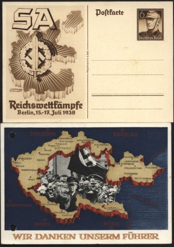 1938 Propaganda GA - Karte ungebraucht SA - Reichswettkämpfe Berlin 15.-17 Juli 1938 und Propagandakarte "Wir Danken Unserm Führer" Farbkarte mit Werbestempel Ostmark 28.12.38 diese Karte gelocht.