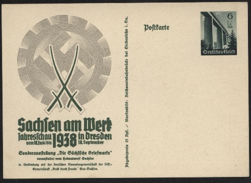1938 Sachsen am Werk. Jahresschau in Dresden Sonderausstellung "Die Sächsische Briefmarke" Nr. P 270 ungebraucht in druckfrischer Erhaltung.