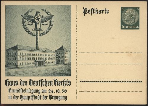 1936 Sonderpostkarte zur Grundsteinlegung des Hauses des Deutschen Rechts in München, ungebraucht.