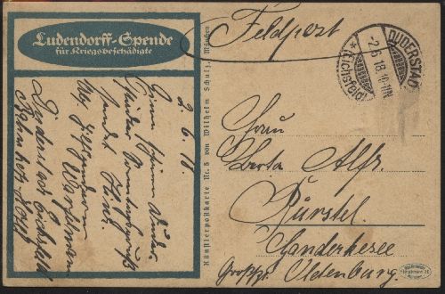 1918 2.6. Ludendorffspende für Kriegsbeschädigte als Feldpostkarte ab Duderstadt nach Ganderkesee.