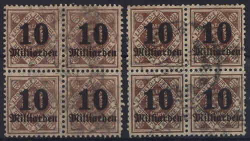 LIQUIDATIONSPOSTEN. 1923 Mi.Nr. 183 , , Dienstmarken Ziffern 10 Mrd. auf 3 Mark, 2mal 4er Blöcke. Zähnung etwas unregelmäßig. Mi.(200.--)Euro.