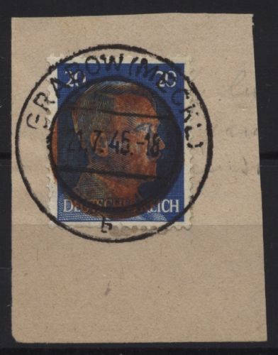 1945 Mi.Nr. 9 , , 20 Pfennig auf Briefstück. Schwärzung der Hitlerkopf - Ausgabe mit Gummistempel, geprüft. Mi.(450.--)Euro.