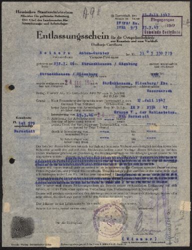 1947 Entlassungsschein v. Hessisches Staatsministerium und Landesamt Internierungs- und Arbeitslager, an die Ortspolizeibehörde Ovelgönne.