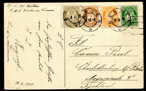 1909/20 Mi.Nr. 75/78 , Norwegen 4 Farben Frankatur auf Postkarte, ab Bergen nach Berlin. Selten.