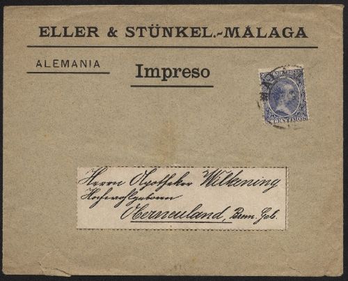 1889 Mi.Nr. 190 , 5 Centimos, Firmen - Auslands - Brief, ab Malaga nach Oberneuland bei Bremen.